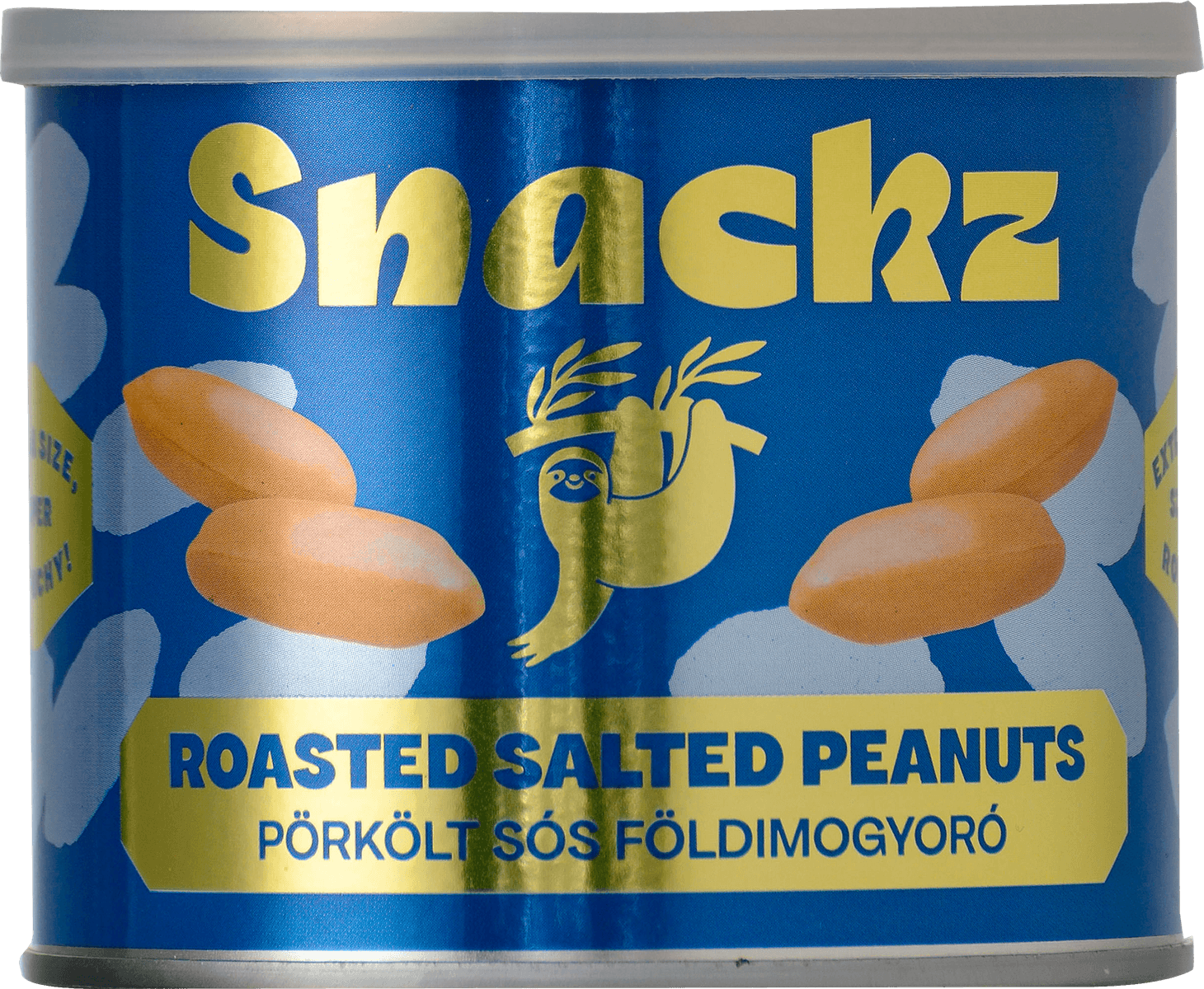 Premium quality, extra crispy, large, salty, roasted peanuts in a metal box.