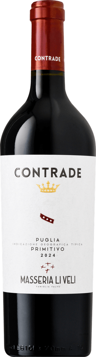 Within the Contrade (meaning: vineyard parcel) range of the Masseria Li Veli winery, one finds wines that belong primarily to the ‘casual’ style category. This wine shows the most charming side of our Primitivo range, fermented and aged in stainless steel tanks to preserve lightness and fruitiness. Deep ruby-red in colour, it highlights the fresh, spicy side of the variety, with notes of blackberry, a touch of tobacco, sour cherry and nutmeg. Light, easy-drinking and elegant in character. Best enjoyed slightly chilled.